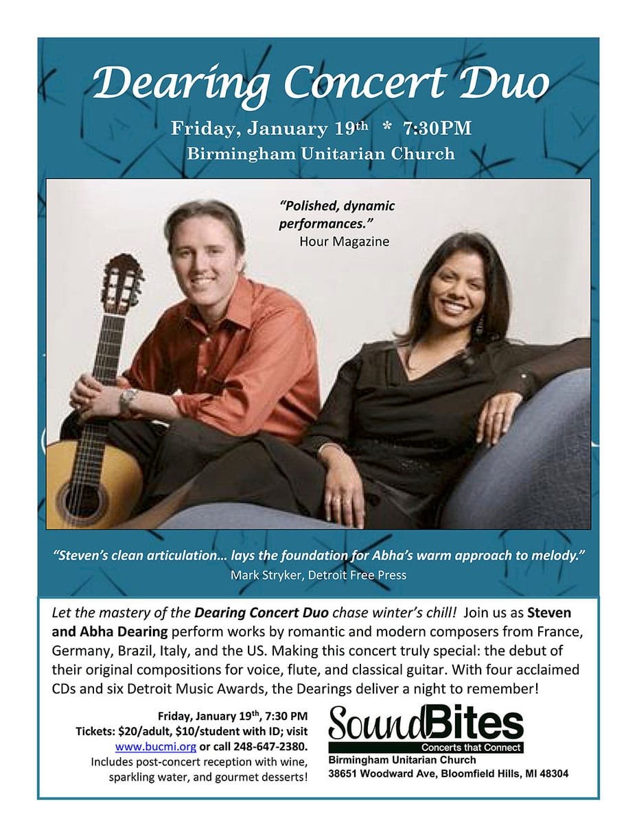 Let the mastery of the Dearing Concert Duo chase winter’s chill! Join us as Steven and Abha Dearing perform works by romantic and modern composers from France, Germany, Brazil, Italy and the U.S. Making this concert truly special: the debut of their original compositions for voice, flute, and classical guitar. With four acclaimed CDs and six Detroit Music Awards, deliver a night to remember!
